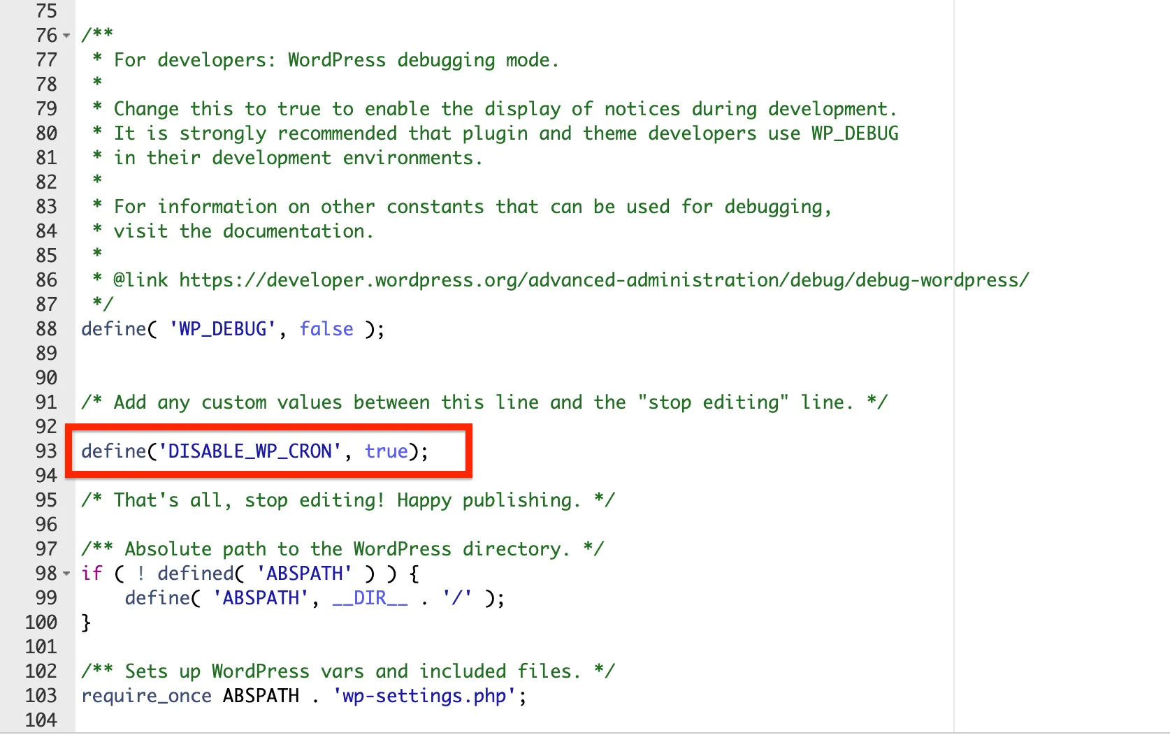 To disable WP-Cron, simply add the following line to your wp-config.php file, found in the root folder of your WordPress installation.
