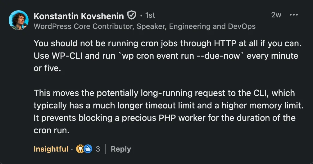 While the improvements came with WordPress 6.9 are important, the fundamental limitations of WP-Cron remain: