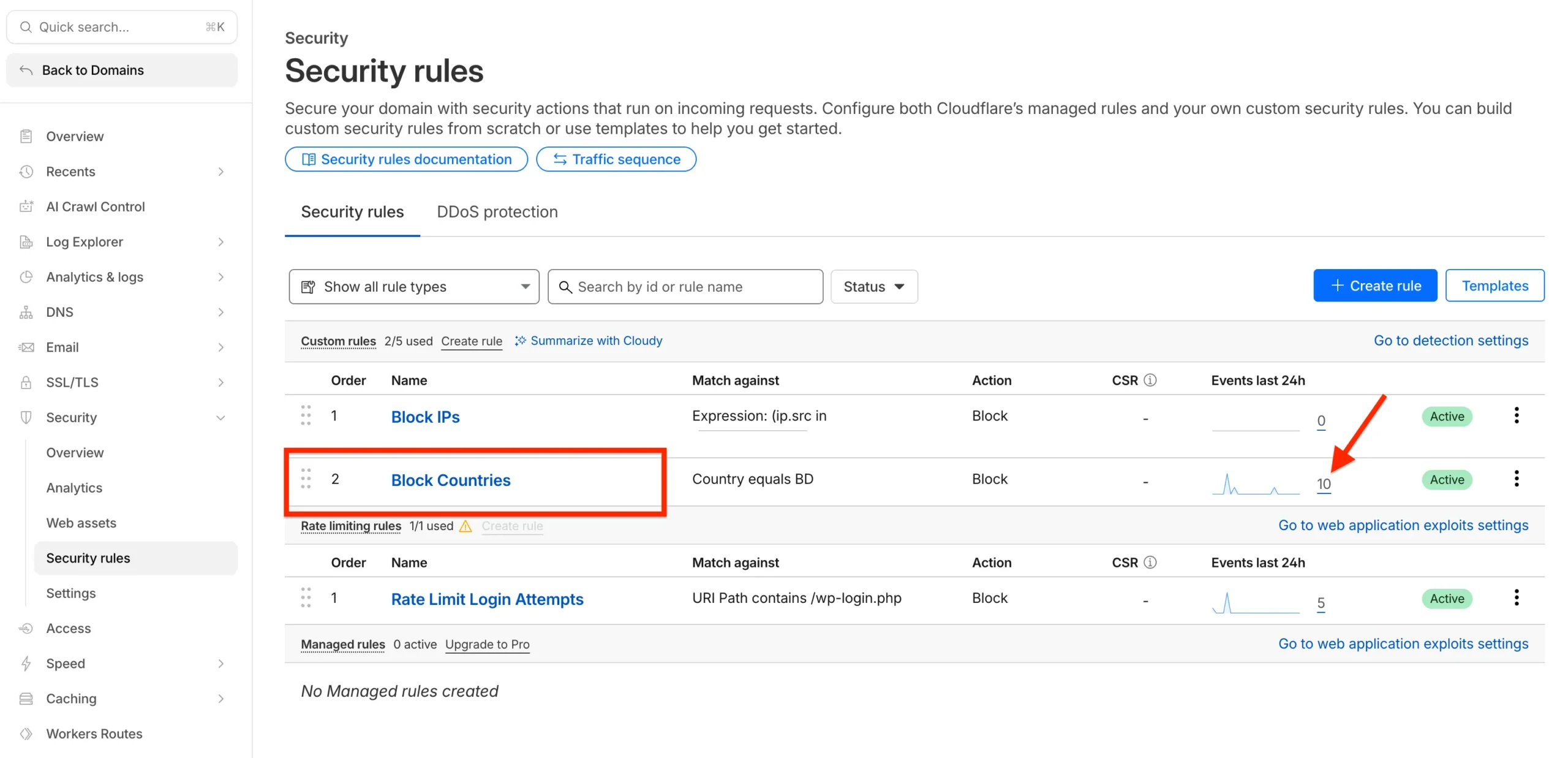 Check Cloudflare’s Security Events by clicking the stats number next to your rule name to see blocked requests in real-time. This helps verify the rule is working and shows you what traffic is being stopped.